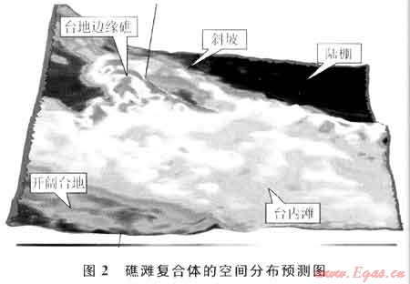 在精細(xì)層位對比解釋的基礎(chǔ)上,基于古地貌恢復(fù)的生物礁灘三維成圖,便可繪制出礁灘復(fù)合體的空間分布圖。圖2為根據(jù)三維地震資料繪制的飛仙關(guān)組沉積前古地貌展布網(wǎng),反映了長興組生物礁的空間展布,早期在臺地內(nèi)形成了灘相沉積,隨著長興期生物礁快速生長和加積,在臺地邊緣形成生物礁灘復(fù)合帶。礁灘復(fù)合體空間分布圖確定后,相應(yīng)的沉積相帶也可解釋出來,圖中可明顯地劃分出陸棚、斜坡、臺地邊緣礁、臺內(nèi)灘、開闊臺地等相帶。