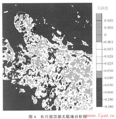 圖4是長興組頂部關(guān)聯(lián)維分析結(jié)果。實鉆的B102井和8103h井在長興組上部鉆遇礁蓋白云巖儲層,B102井測試獲工業(yè)氣流,不含水,而8103h井出水,且海拔位置比B102井還高,證明這2口井分屬不同的氣藏,儲層預(yù)測及反演結(jié)果難以進(jìn)行區(qū)分,而基于波形復(fù)雜程度的關(guān)聯(lián)維分析表明兩二者之間存在變化且互不連通。因此可以利用反映波形復(fù)雜程度的屬性來刻畫儲層的非均質(zhì)性和復(fù)雜性,但無法區(qū)分礁和灘。