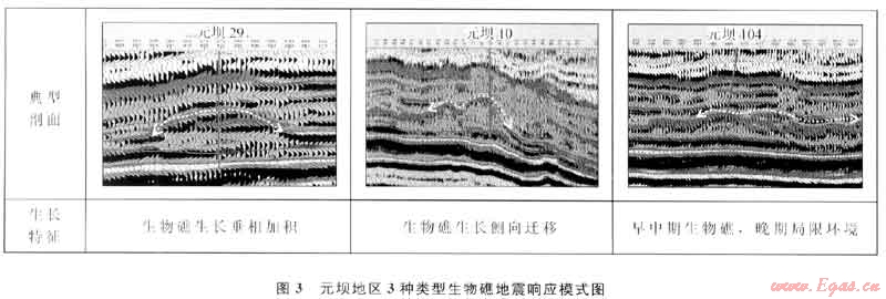 通過對(duì)元壩地區(qū)鉆錄井和三維地震資料的綜合分析,依據(jù)生物礁特征劃分提出了3種類型的生物礁:垂向加積生物礁、側(cè)向遷移生物礁及早期生物礁(圖3),3種生物礁的生長(zhǎng)與儲(chǔ)層發(fā)育均具有顯著特點(diǎn)。在該認(rèn)識(shí)的指導(dǎo)下,提高了生物礁描述及井位優(yōu)選精度,保證了勘探部署井的高成功率。