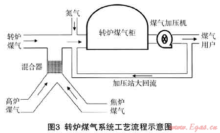 (2) 利用轉(zhuǎn)爐煤氣柜、煤氣加壓站、合成轉(zhuǎn)氣混合站等設(shè)施,在實(shí)際生產(chǎn)過程中町以實(shí)現(xiàn)焦?fàn)t煤氣和氮?dú)庵g的定量、均勻混合,合成后的混合氣可以通過加壓站供給用戶使用。
