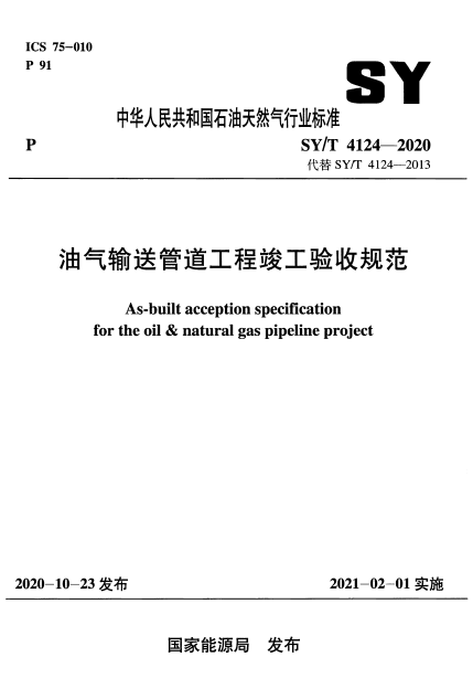 油氣輸送管道工程竣工驗收規(guī)范SY/T 4124-2020 :本規(guī)范共分10章和3個附錄,主要技術(shù)內(nèi)容是:總則、術(shù)語、竣工驗收條件、竣工驗收依據(jù)、竣工驗收組織、竣工驗收準(zhǔn)備工作、竣工驗收程序、專項驗收、項目文件編制、竣工驗收文件等。