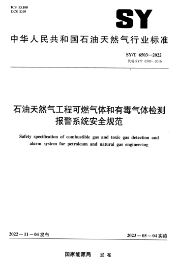 石油天然氣工程可燃氣體和有毒氣體檢測報警系統(tǒng)安全規(guī)范SY/T 6503-2022:本文件規(guī)定了石油天然氣工程中可燃氣體和有毒氣體檢測點的確定,探測器、報警控制單元和現(xiàn)場警報器的選用、安裝、檢查、維護、檢定及報廢等基本要求。