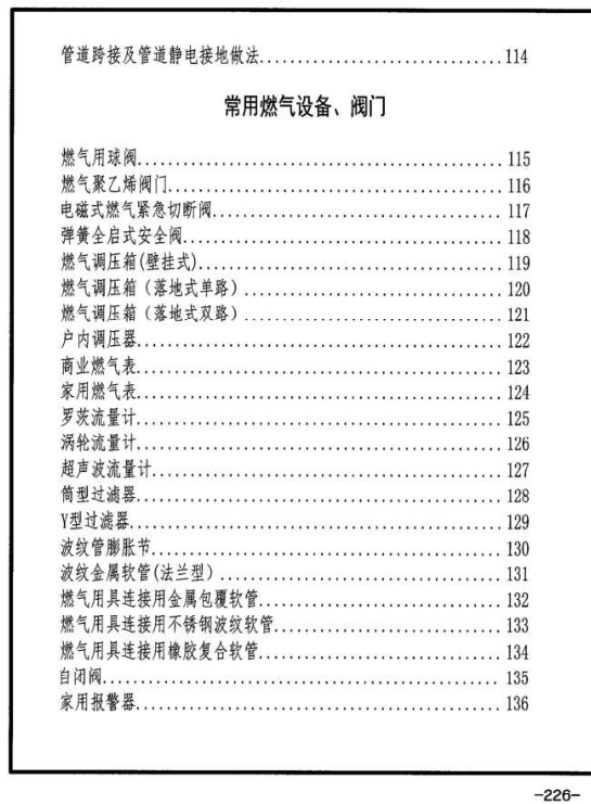 3.10本圖集“常用燃?xì)庠O(shè)備、閥門”列示了常用閥門、調(diào)壓箱、計(jì)量表等,根據(jù)最新國(guó)家規(guī)范的要求,增加了燃?xì)庥镁哌B接用不銹鋼波紋管、燃?xì)廨斔陀貌讳P鋼波紋管,自閉閥等國(guó)家規(guī)范要求或推薦使用的材料。由于市場(chǎng)上燃具和用氣設(shè)備種類繁多、更新?lián)Q代較快,故取消了原燃具和用氣設(shè)備圖示。